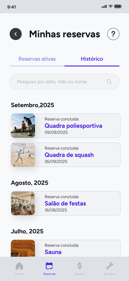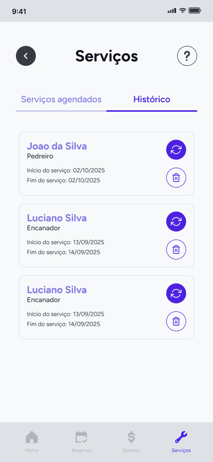 A solução foi um protótipo interativo de alta fidelidade, projetado com base nas heurísticas de Nielsen. O design inclui os fluxos de usuário essenciais: desde a integração (tutorial) e login, passando por toda a jornada de reserva de espaços (criar, alterar e excluir), até consultas financeiras (faturas duplicadas) e registro de prestadores de serviços. Outros alunos da CESAR School colaboraram neste projeto: Clara Maria Bandeira, Clara Borges, Darci Ayres, Joel Dionizio, Miguel Leal, Joana Flora e Victor Burle.